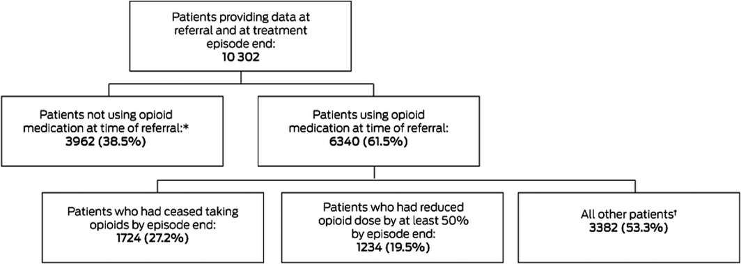 To explore the impact of changes in opioid use on outcomes for patients, we analysed ePPOC data collected at 67 pain services (online Supporting Information) during January 2015 – June 2020. We extracted data for all patients with completed episodes of care and who had answered questions about opioid use at referral and episode end. We summarised their characteristics and outcomes as means with standard deviations (SDs). All analyses were conducted in SAS 9.4. Our study was approved by the University of Wollongong and Illawarra and Shoalhaven Local Health District health and medical human research ethics committee; reference, 2019/ETH03804).