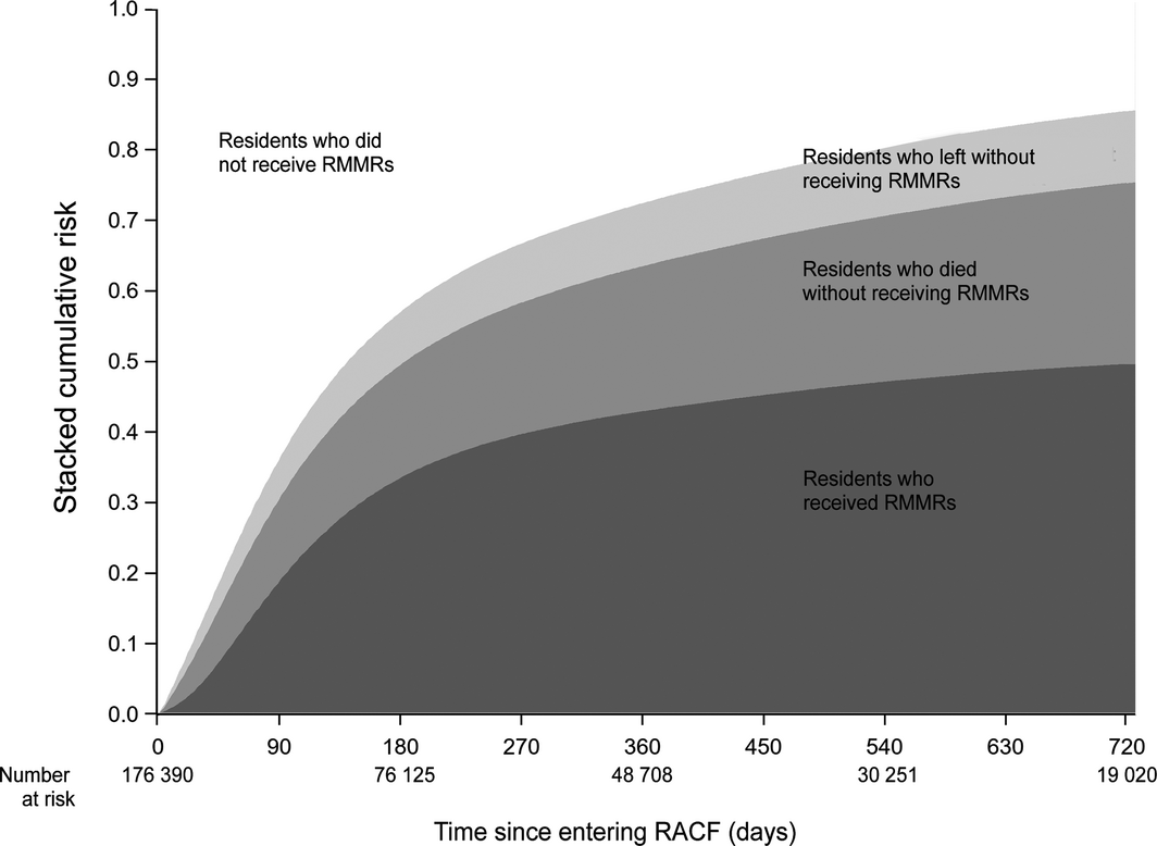 By three months after RACF entry, 19.1% of residents (Wald 95% confidence interval [CI], 18.9–19.3%) had received RMMRs, 11.8% (95% CI, 11.6–11.9%) had died without RMMRs, and 5.7% (95% CI, 5.6–5.8%) had left their RACF for other reasons without RMMRs. At 12 months, 43.1% (95% CI, 42.8–43.3%) had received RMMRs, 20.6% (95% CI, 20.5–20.8%) had died without RMMRs, and 9.0% (95% CI, 8.8–9.1%) had left without receiving RMMRs. By 24 months, 49.7% (95% CI, 49.5–50.0%) had received RMMRs, 25.8% (95% CI, 25.6–26.0%) had died without RMMRs, and 10.2% (95% CI, 10.1–10.4%) had left their first RACF for other reasons without receiving RMMRs (Box).