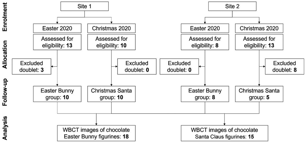 The CRECHE (Computed tomography to Rebut the myth that chocolate Easter and Christmas Hollow figurines are re‐used and may not be safely Edible) study was conducted at two tertiary referral trauma centres in Germany (Berlin and Duisburg) and their departments of radiology. The study was prospectively registered with Current Controlled Trials (2 July 2020; https://www.isrctn.com/ISRCTN16847363).