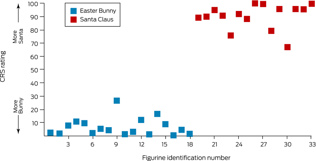 Box 3 – Mean contour resemblance scale (CRS) ratings by four expert radiology assessors of 18 Easter Bunnies and 15 Santa Clauses, based on computed tomography images