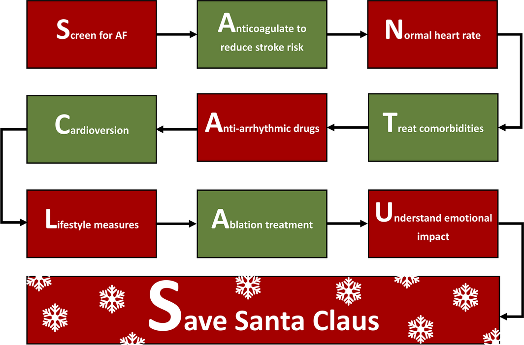 Atrial fibrillation (AF) is the most common cardiac rhythm disturbance in the world, with a lifetime risk estimate of 1 in 3.1 Unlike other prominent world figures, Santa Claus’ medical background is strictly confidential and not explicitly stated in the medical literature. However, it seems highly probable that, given his advanced age and risk factors, he will one day present with new onset AF. Despite this pressing issue, guidelines on the management of AF in Santa Claus are lacking: we performed a search on PubMed of “Santa Claus” AND “atrial fibrillation” on 25 December 2020 and found no results. To aid fellow clinicians, we have developed a guide on this topic, underpinned by the latest North Pole Institute for Christmas Excellence (NICE), Elvish Society of Christmas (ESC), and Nativity, Holidays and Festivities Association (NHFA) guidelines.2,3,4 For simplicity, we propose the following mnemonic: SANTA CLAUS (Box). This stands for: Screen for atrial fibrillation; Anticoagulate; Normalise heart rate; Treat comorbidities; Anti‐arrhythmic drugs; Cardioversion; Lifestyle measures; Ablation treatment; Understand emotional and psychological impact; Save Santa Claus.