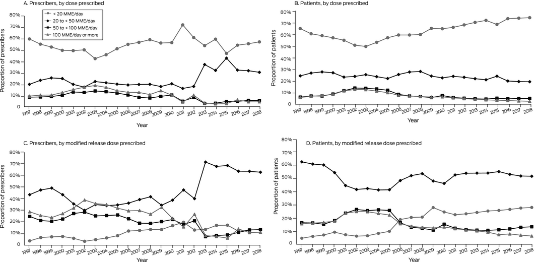 The number of patients for whom opioids were dispensed increased from 28 299 in 1997 to 322 307 in 2018; the number of Queensland medical practitioners who prescribed opioids increased from 4537 to 20 226 (online Supporting Information, table). The proportion of opioid prescribers who prescribed opioids at doses of 50 to less than 100 MME/day peaked in 2003 (813 of 5530, 14.7%), as did the proportion prescribing 100 MME/day or more (1077, 19.5%), before declining in 2018 to 1294 (6.4%) and 1064 of 22 941 (5.3%) respectively (Box 1, A; Supporting Information, figure). During 1997‒2018, 1 916 842 people (67.8% of people dispensed opioids) were dispensed doses of less than 20 MME/day, 624 114 were dispensed 20 to less than 50 MME/day (22.1%), 159 448 were dispensed 50 to less than 100 MME/day (5.6%), and 127 323 were dispensed 100 MME/day or more (4.5%) (Box 1, B). For modified release opioids, the largest proportions of prescribers and patients were for the 20 to less than 50 MME/day dose category (Box 1, C, D).