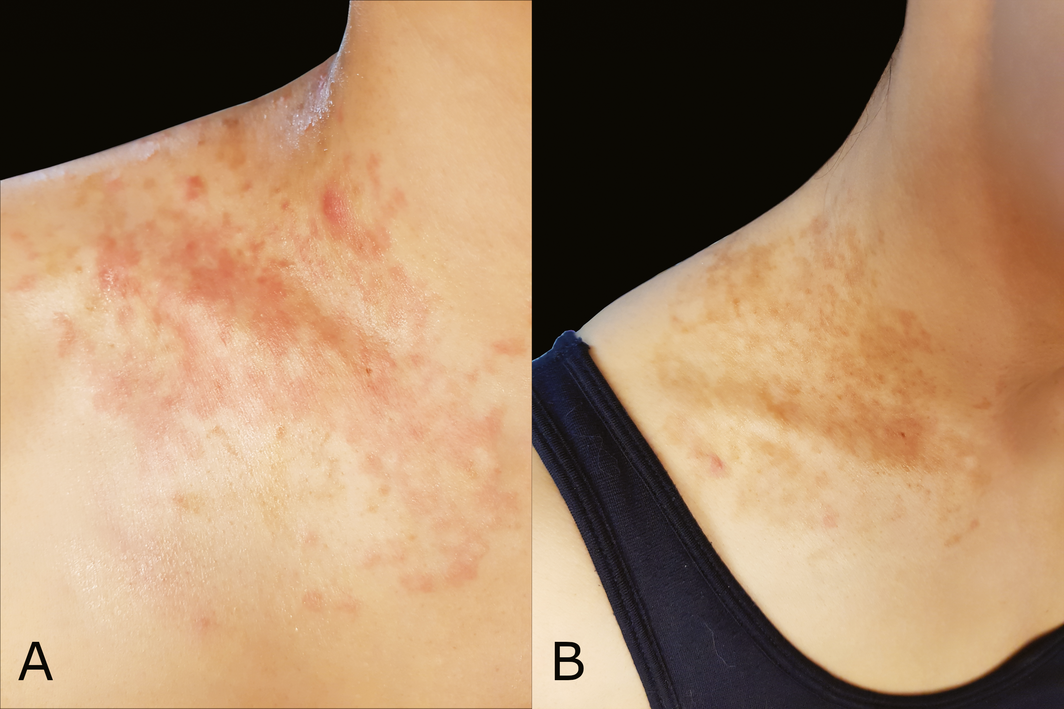 A 29‐year‐old Korean woman presented with a pruritic, reticulate, red‐brown, papular eruption overlying her clavicle and neck, occurring in the setting of carbohydrate restriction (Figure, A and B). Medical history included polycystic ovarian syndrome, impaired fasting glucose, and anorexia nervosa (in remission). Biopsy revealed non‐specific changes and a clinical diagnosis of prurigo pigmentosa was made. Rapid resolution occurred with minocycline and re‐introduction of complex carbohydrates.
