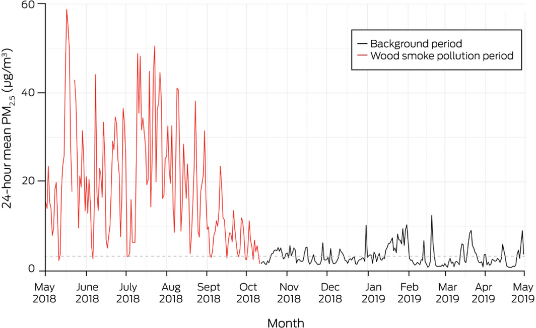 Larger proportions of households in regional Australia use wood heating than in metropolitan areas. Air pollution monitoring in regional towns is generally limited, leading to misperception of the magnitude of wood heater pollution and the associated health burden. In 2018, an NSW government air pollution monitoring station was installed in Armidale (Northern Tablelands; population, 24 504), complemented by a network of eleven calibrated low cost monitors,9 enabling detailed characterisation of population PM2.5 exposure by season. In winter, cold, frosty nights are typical for Armidale, and about 40% of households use wood heating, the main source of air pollution in the city.9 Air pollution in Armidale exceeded the national daily PM2.5 standard (25 µg/m3) on 32 days in 2018; all exceedances were attributable to winter wood heater pollution10 (Supporting Information, part 2).