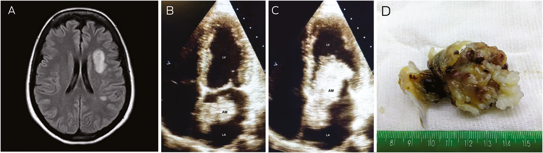 A previously healthy 45‐year‐old woman presented with a history of sudden‐onset right hemiparesis and dysarthria while walking. Physical examination, including of the cardiovascular system, was unremarkable apart from the neurological deficit. A magnetic resonance imaging scan of the brain showed high signal lesions in the left middle cerebral artery territory (Figure, A), confirming a recent infarction probably of embolic origin. The electrocardiogram was normal, but the echocardiogram (Figure, B and C) showed a left atrial solid mass (atrial myxoma [AM]) that occupied part of the left atrium (LA) during systole (Figure, B) and prolapsed into the left ventricle (LV) during diastole (Figure, C). The mass was excised 30 days after the stroke and the diagnosis of a giant (6.4 × 3.6 cm) atrial myxoma was confirmed (Figure, D). At 12‐months’ follow‐up, the patient had mild hemiparesis, normal speech, and no cardiac dysfunction. Stroke in young adults is less frequent and has different aetiologies compared with older individuals. Atrial myxoma is the most common cardiac tumour1 and needs consideration when investigating younger patients with stroke.