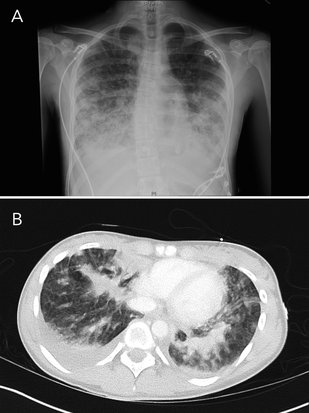In September 2020, a Sydney public health unit was notified of the admission to a tertiary paediatric hospital intensive care unit of a 15‐year‐old girl with suspected e‐cigarette or vaping product use‐associated lung injury (EVALI), a pulmonary syndrome first reported in the United States.1 The girl had presented to another Sydney hospital with a 4‐day history of dysuria, urinary frequency and back pain followed by 2 days of vomiting and rigors. She was initially treated for urosepsis with intravenous antibiotics. She reported vaping nicotine two to three times weekly for the previous 7 months. She was febrile at 38°C, with a heart rate of 120–140 beats per minute, blood pressure of 110/80 mmHg, respiratory rate of 20 breaths per minute, and oxygen saturation of 92–95% on room air. A chest x‐ray showed bilateral pulmonary infiltrates that were worse in the lower zones (Box 1). Within hours, she became hypoxic, with oxygen saturation of 87% on room air. Abdominal computed tomography showed no abdominal pathology, but there were extensive pulmonary infiltrates in the lung bases with bilateral effusions (Box 1). Her urine drug screen result on the day of admission was positive for cannabinoids and benzodiazepines.