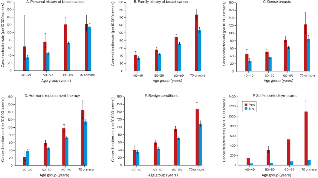 Cancer detection rates were higher for women with personal histories of breast cancer or benign breast conditions or first degree family histories of breast cancer, women with dense breasts or self‐reported breast‐related symptoms, and women using HRT. In addition, some risk factor‐specific outcomes differed by age group. Our findings could inform discussions of the role for risk‐stratified screening in Australia and overseas, and may assist planning of research for generating evidence on its clinical and cost‐effectiveness.