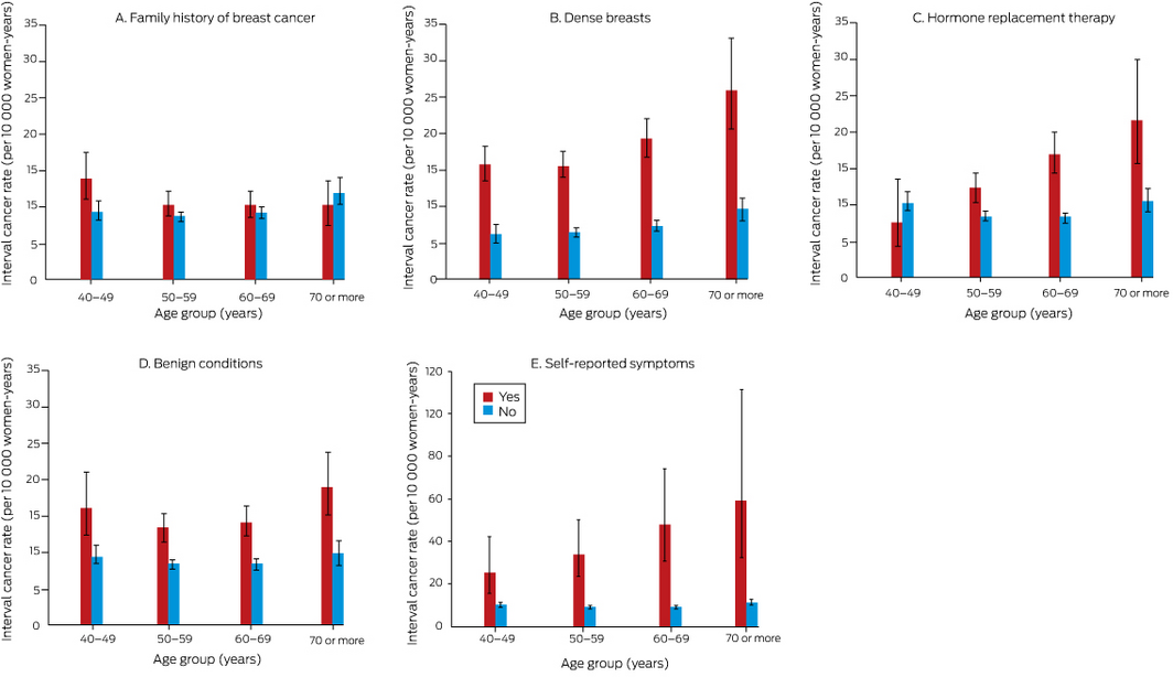 We quantified rates of breast cancer diagnosed at mammography screening and between screens according to risk factors and age groups in a large, representative cohort of Australian women. The proportions of screen‐detected small invasive cancers (≤ 15 mm; 49% in first screens and 61% in repeat screens) were similar to those in the BreastScreen Australia performance report (48% in first screens, 61% in repeat screens2). The recall rate was modest (3.7%) and the only risk factor associated with a markedly higher recall rate was reporting breast‐related symptoms (12.6%). The CDR was higher for women with first degree family histories of breast cancer, personal histories of risk‐relevant benign breast conditions, dense breasts, and self‐reported breast symptoms, as well as for those using HRT, which was also associated with a higher ICR, as were family history and dense breasts (albeit not statistically significantly).