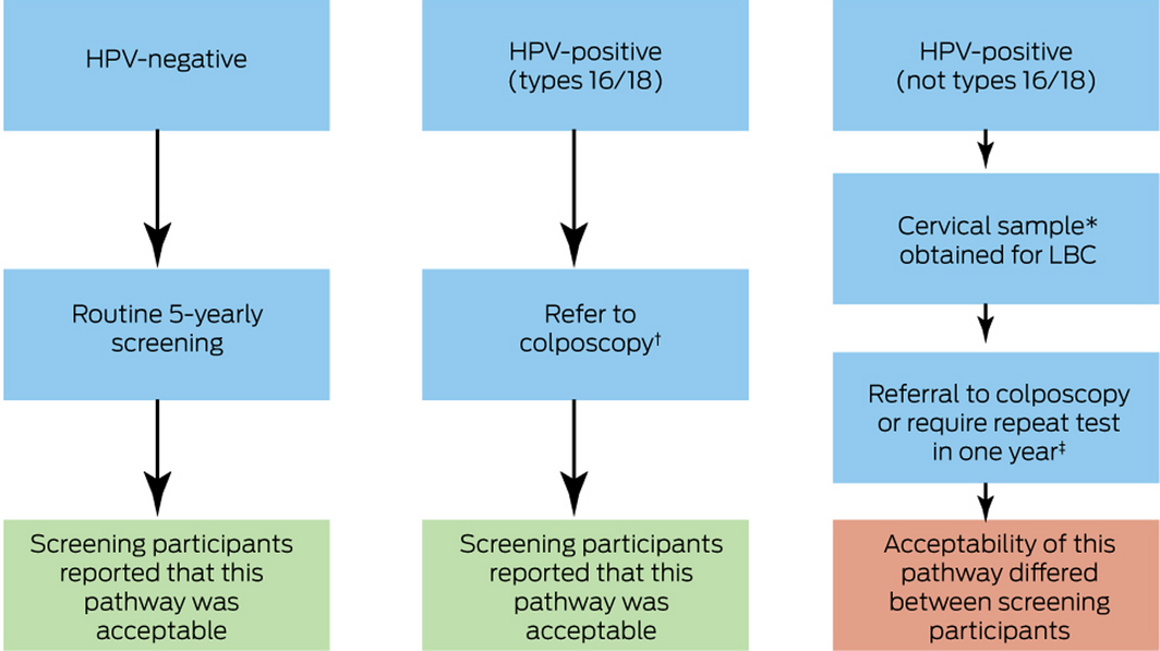‡ Depending on the LBC result (clinician‐collected cervical screening test sample), screening participants may require a colposcopy or a repeat sample in 12 months.2