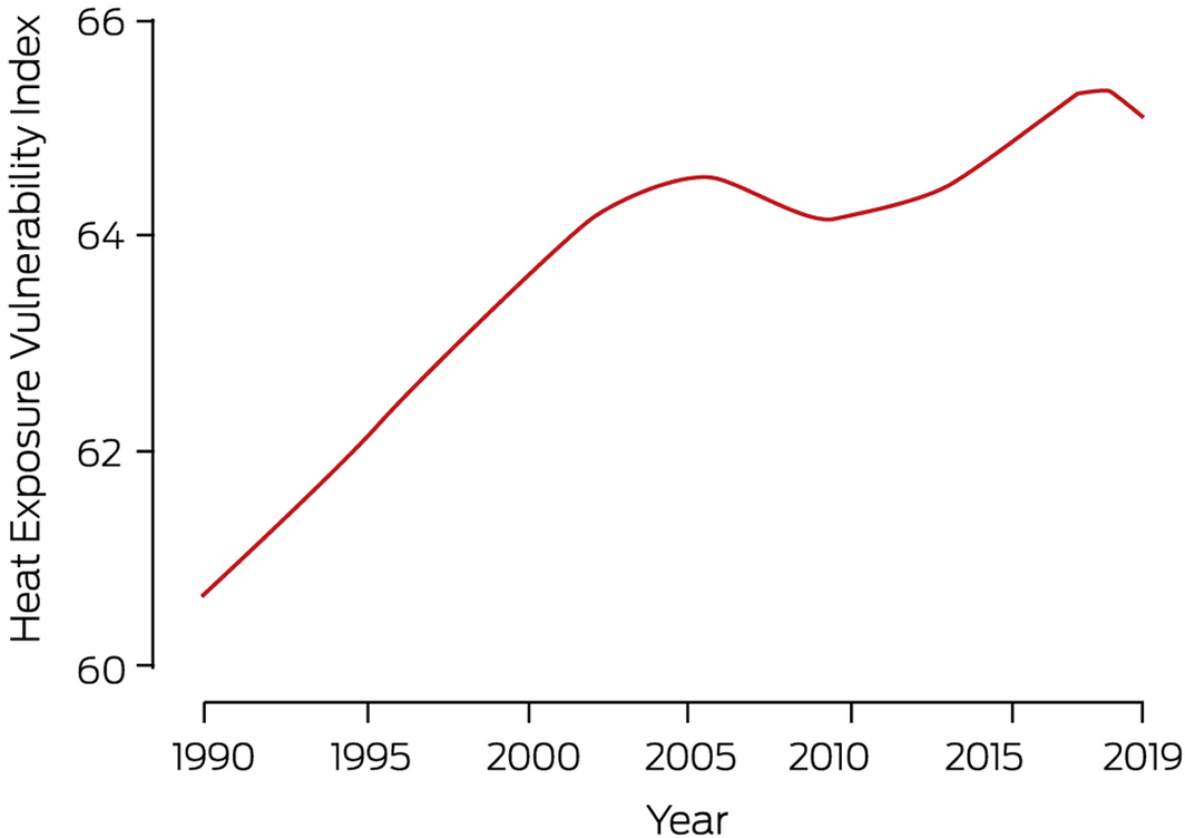 This indicator reports the Heat Exposure Vulnerability Index (HEVI) for Australia. The HEVI is a measure of potential vulnerability of a country to heat exposure and is based on the proportion of the population aged over 65 years, the prevalence of underlying diseases in this subpopulation, and the proportion of the population living in urban areas (Supporting Information 1.1). People older than 65 years and those with pre‐existing medical conditions are particularly vulnerable to the negative health impacts of exposure to extremes of heat, and those living in urban areas are particularly vulnerable because of the inherently higher temperatures in urban areas compared with adjacent areas, as a result of the urban heat island effect. This composite index ranges from 0 to 100, with higher scores representing greater vulnerability.