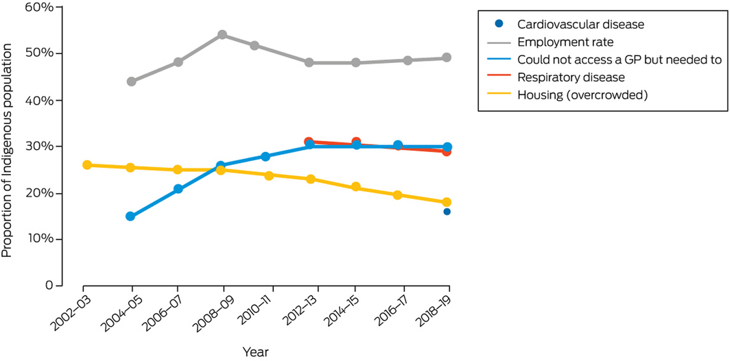 Climate change is disproportionately harmful to Indigenous Australians.14 However, this can be difficult to quantify, being frequently constrained by many factors. The approach taken for this new indicator has been to extract the most climate‐relevant and sensitive indicators from each of three tiers (health status and outcomes; determinants of health; and health system performance) from the Australian Institute of Health and Welfare’s Aboriginal and Torres Strait Islander Health Performance Framework report15 (Box 2).