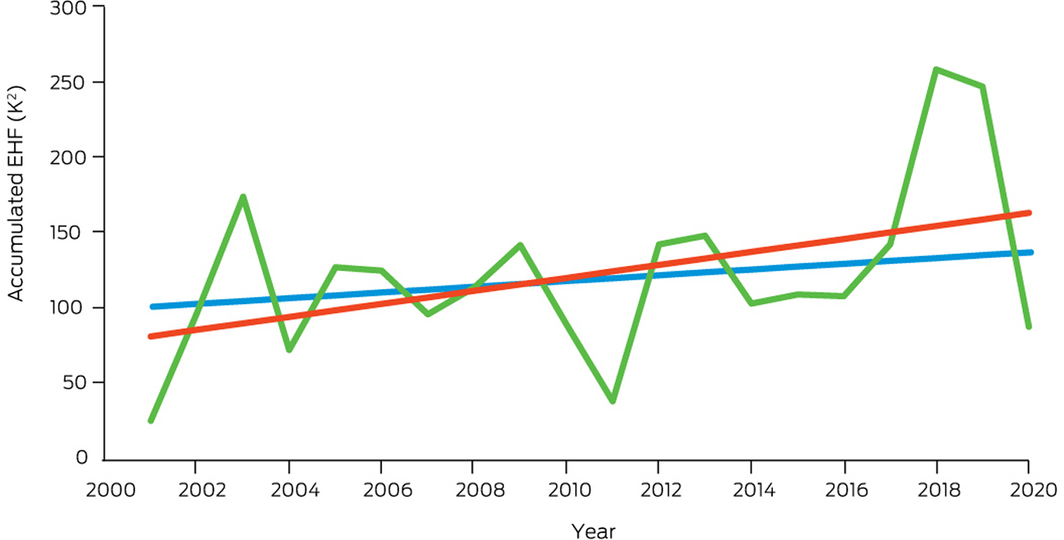 Calculating the trend through the 20 years presented (2001–2002 to 2020–2021), and a longer 50‐year trend (1971–1972 to 2020–2021), allows an assessment of medium and long term change, respectively (Box 3). The long term trend demonstrates a 36% increase in excess heat factor over the most recent 20‐year period, whereas the medium term trend shows a 103% rise over this period. This result reveals an accelerated rate of increase over the past 20 years. Weighting the accumulated excess heat factor according to the population density has a similar result, with the 50‐year and 20‐year heatwave season accumulated excess heat factor rises being 30% and 83%, respectively. These percentage changes are smaller than those reported in the 2020 MJA–Lancet Countdown report,7 in part because the 2020–21 summer was cooler than the 2019–20 summer. Impacts will continue to rise because of the general increase in ambient temperatures and will be especially large during and shortly after heatwave events.