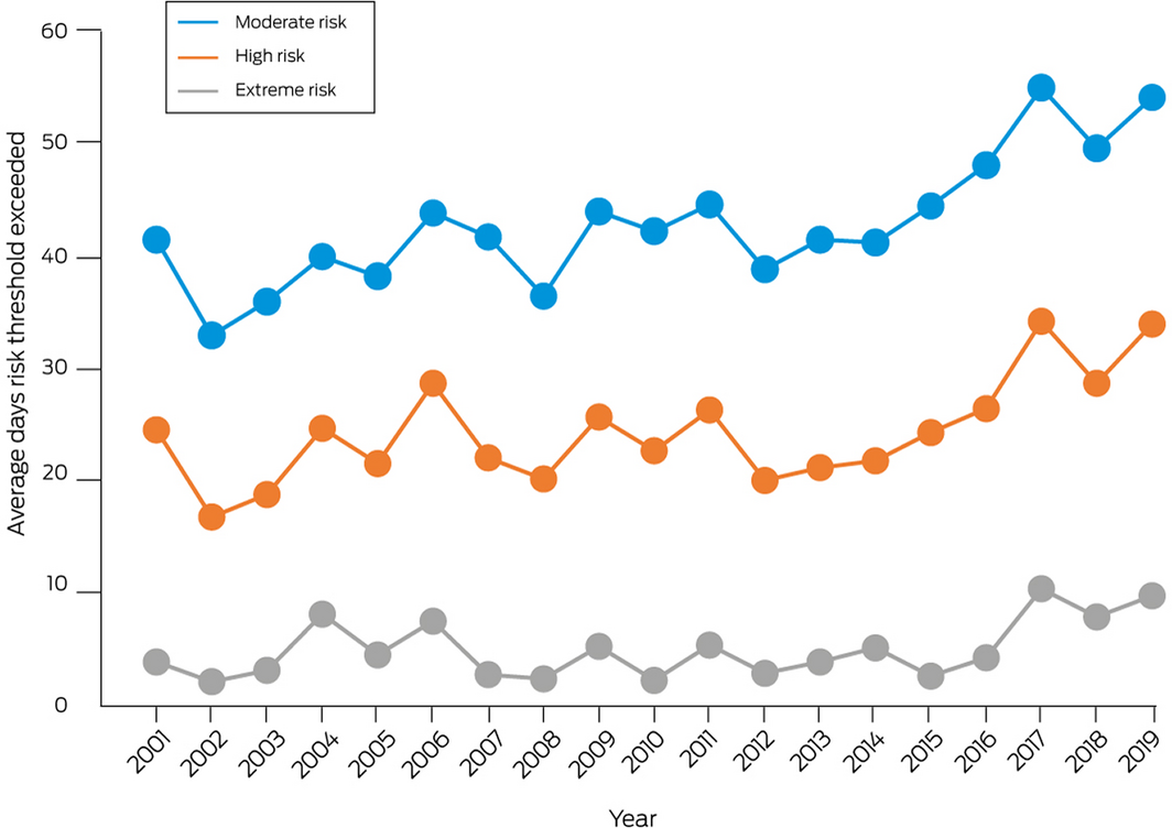 In conclusion, while most deaths from non‐optimal temperatures arise due to cold, increasing heat exposure remains a leading health risk in Australia. Heatwave intensity is growing exponentially, reducing productivity across all sectors of the economy and hampering sporting participation. Despite a cool summer and flooding rains in 2020–2021, the frequency and severity of bushfires and droughts have continued their upward trend.