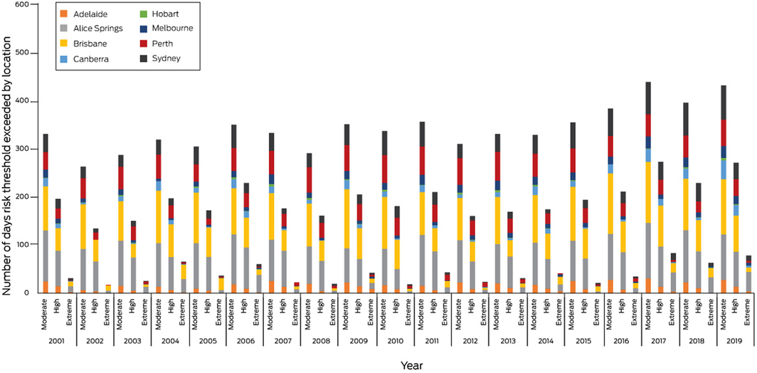 On average across Australia, weather conditions in 2019 led to the second greatest number of days that all three risk thresholds were exceeded since 2001 (Box 4). Relative to a 5‐year average (2001–2005), the number of days that activities would have been suspended due to extreme heat risk more than doubled in 2019, while activities became about 1.5 times more likely to have been interrupted due to moderate or high heat stress risk.