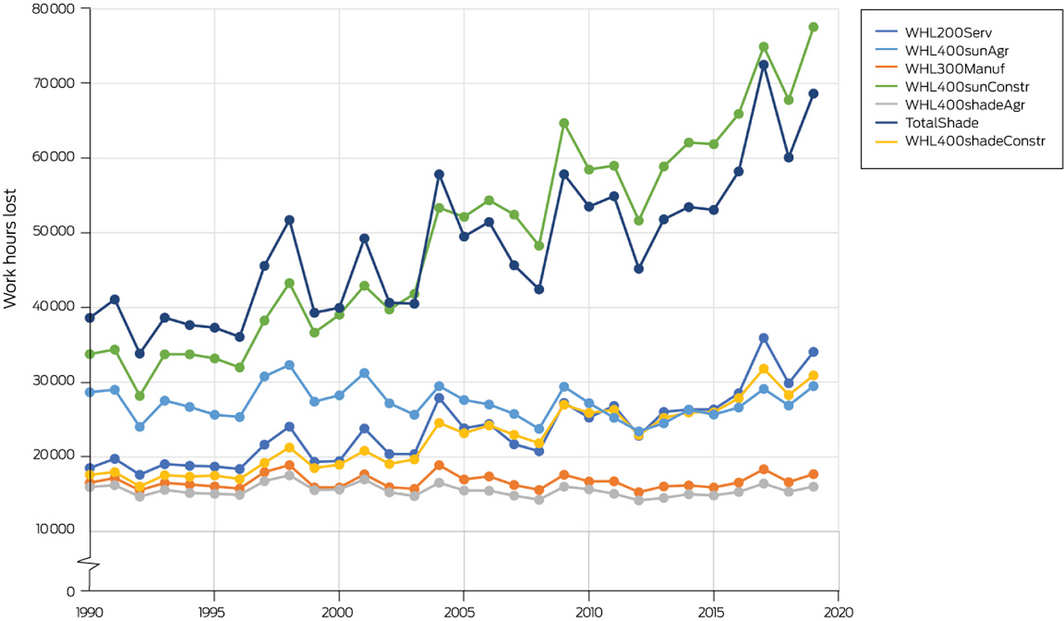 For work in the shade, 58 673 potential hours of work were lost due to heat stress across Australia in 2019, compared with a 10‐year average of 31 227 hours between 1991 and 2000. Work in the service sector represented the greatest share of these lost hours (41.0%), followed by construction (35.6%), manufacturing (13.1%) and agriculture (10.3%). For work in direct sunlight, the construction sector lost the most hours (67 565) in 2019 compared with a 1991–2000 average of 25 240 hours (Box 6). Shaded work hours lost in 2019 were greatest in New South Wales (18 239), followed by Queensland (17 521), Victoria (7552) and the Northern Territory (6931) (Supporting Information 1.5, Figure A1).