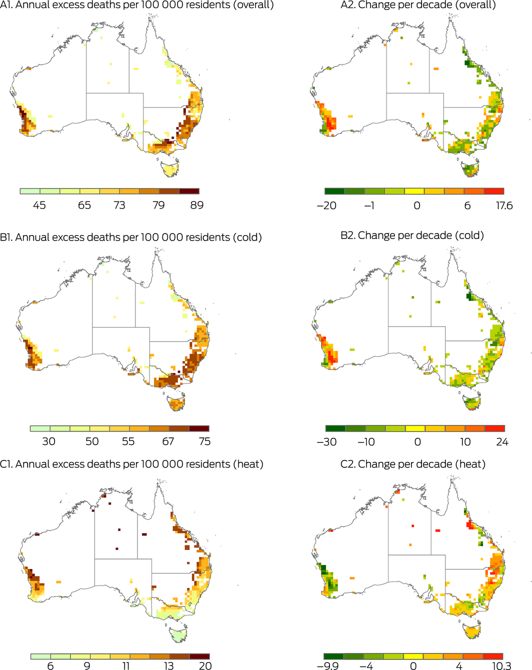 The association between non‐optimal temperatures and premature deaths has been frequently reported, with the strength of the relationship varying in different populations.22 However, the mortality burden attributable to non‐optimal temperatures across Australia has not been well quantified at the national level. This indicator shows that 11.40% (95% confidence interval [CI], 6.99–16.50%) of Australian deaths are associated with non‐optimal temperatures, equating to 74 excess deaths per 100 000 residents annually (Supporting Information, Table A1). There is great spatiotemporal variation of the mortality burden due to non‐optimal temperatures (Box 7; Supporting Information 1.6). Most excess deaths are currently explained by cold exposure (9.81%; 95% CI, 6.38–13.74%), but as shown in Box 7 (B2 and C2), in large parts of eastern Australia excess deaths due to cold are decreasing over time, and excess deaths due to heat are increasing over time.