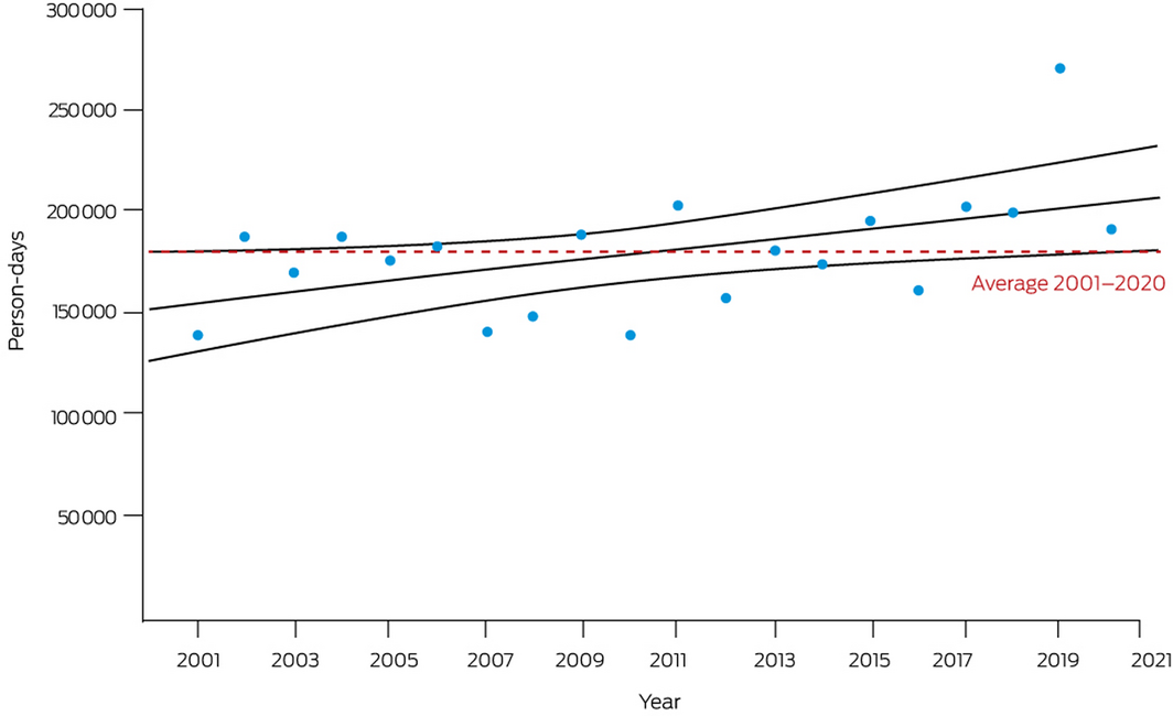Estimated person‐days of exposure to landscape fire for 2020 were calculated from satellite‐observed active fire spots and population density data on a 10 km × 10 km grid. The 2020 calculation of 190 774 person‐days of exposure was lower than the 2019 peak of 270 997 but in keeping with a steady upward trend since 2001 (Box 8; Supporting Information, Table A2). Many factors likely contribute to this trend, including an increasing frequency of conditions favourable to bushfires, increasing use of planned burning to mitigate bushfire hazards (which is also captured in the satellite‐observed landscape fire data), and trends in population size and settlement patterns (Supporting Information 1.7).26