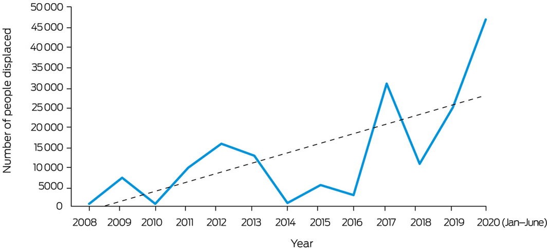 In 2019, there were 25 000 people displaced by weather‐related disasters in Australia, primarily bushfires.29 In early 2020, bushfires triggered around 47 000 displacements in Australia,30 continuing an upward trajectory since 2008 (Box 9). Health outcomes of climate‐related mobility will depend on context; health threats may result from disruptions to food access, housing, social networks, attachment to place, and health service access (Supporting Information 1.9).31,32