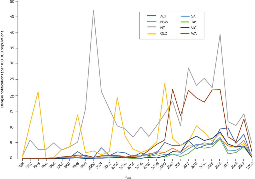 There is an upward trend apparent in national annual dengue incidence (Supporting Information, Figure A6). This may arise from more frequent infections acquired overseas, from either increased passenger arrivals or more intense transmission overseas, or from a combination of both. This hypothesis is supported by the decline to near zero incidence in dengue virus and Ross River virus since international borders closed as a coronavirus disease 2019 (COVID‐19) response, while the climate remains suitable for transmission. Trends in Queensland suggest that although climate conditions are highly suitable for dengue, public health measures largely determine transmission, preventing dengue from becoming endemic. The climate in northern Australia, already suitable for high mosquito vector density and dengue transmission much of the year,33 may become even more favourable with climate change (increased temperature, humidity, rainfall), rendering future control potentially more difficult.