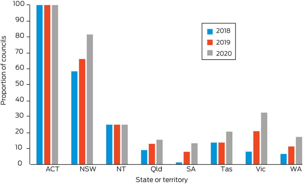 Queensland and Victoria remain the only jurisdictions to have a specific health adaptation plan, as noted previously in the 2020 MJA–Lancet Countdown report.7 The Australian Capital Territory has health included in detail as part of its comprehensive adaptation strategy.36 Similarly, South Australia has climate change adaptation as part of its state public health plan.37 Following the Climate Health WA Inquiry, WA now has a blueprint for the next decade of its health system’s response to adapt to climate change to protect the health of the community and how health services can reduce emissions and waste.38 Tasmania held an expert roundtable in 2019 as a step towards developing its health adaptation plan.39 Based on our searches of public‐facing websites, NSW and the NT do not have climate change and health adaptation plans (Supporting Information 2.1).