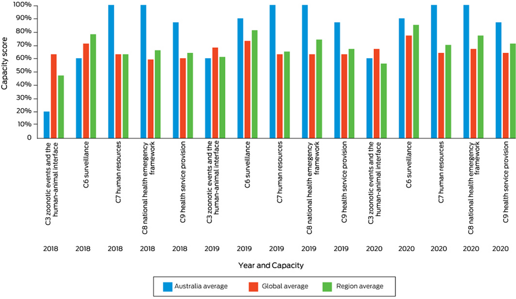 The International Health Regulations (2005)53 (IHRs) are an instrument of international law to prevent, protect against, control and provide a public health response to potential public health emergencies and the international spread of infectious disease. With weather and climate causing or contributing to many public health emergencies and the spread of many infectious diseases, the IHRs serve as an important indicator of national climate change and health adaptive capacity. Countries report to the World Health Assembly on the implementation of the IHRs across 13 capacities. For this indicator, we track Australia’s reported implementation of the national health emergency framework capacity. We found that Australia achieved the top score of 100% for this capacity since it was introduced by the WHO in 2018 (Box 12). Limitations of the IHRs in ensuring an effective response to the COVID‐19 pandemic have been identified and continue to be evaluated and reviewed. However, countries with higher capacity scores were found to have lower incidence and mortality per 100 000 population within 30 days from first COVID‐19 diagnosis, stressing the relevance of the IHRs.54 For continuity with previous reports,6 we also report here Australia’s surveillance and public health human resources capacities. While the latter continues at 100%, the former has dropped below this level. We also highlight that Australia’s zoonotic events and the human–animal interface, and health service provision capacities have been below 100% over this period (Supporting Information 2.5).