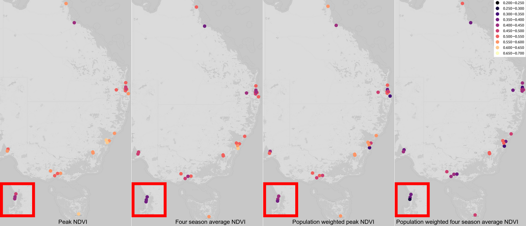 In Table A4 in the Supporting Information, levels of greenness for the four metrics are broken down by percentage of population. Only 3% of Australians live in an area with very high peak greenness and 1% in very high average four‐season greenness; 82% live in areas with a high peak greenness and 66% in high average greenness. Weighted by population, this drops to 16% and 3% for peak and average greenness. For levels of moderate greenness, the percentages for the four metrics are 15%, 21%, 80% and 16%, respectively. When weighted by population, 78% of Australians live in areas of low greenness across four seasons, while 12% live with low greenness across an unweighted four‐seasons average (Supporting Information 2.6). In addition to the localised urban cooling that vegetation can provide, urban greenspace can provide areas to facilitate increased physical activity and social interactions, and help to reduce stress levels and exposure to air and noise pollution.57,58 This means that these benefits are not shared equally with those in less privileged areas.