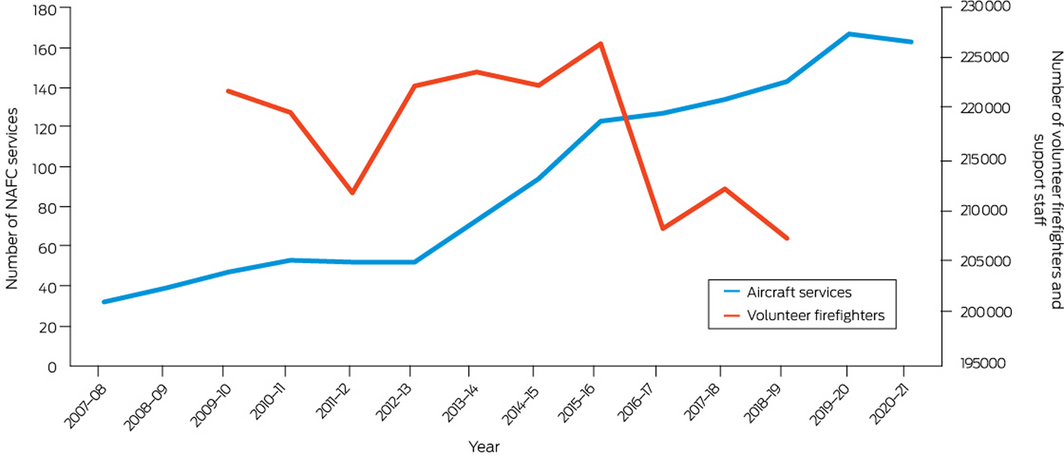 To track progress on bushfire adaptation in Australia, our 2021 report introduces a new indicator that analyses aerial and terrestrial firefighting capacity (Box 14). Although National Aerial Firefighting Centre aircraft services have increased since 2007–08, from just over 30 to the current 160 or so, the number of volunteer firefighters and support staff has decreased in the most recent 3 years for which data are available (2016–17 to 2018–19) (Supporting Information 2.7).