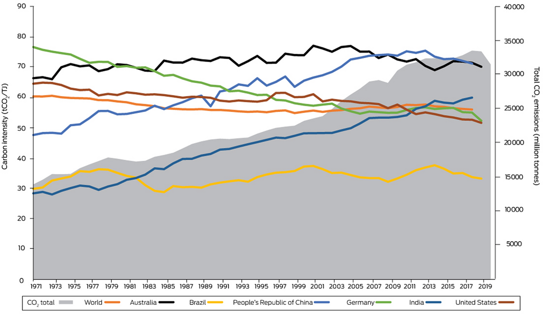 As in our 2019 report, we define the carbon intensity of the energy system as “the tonnes of CO2 emitted for each unit of primary energy supplied”.6 Data used in our 2019 report were only available up to 2016.6 In 2021, new data have become available60 — up to 2019 for Australia, Brazil, Germany and the US, and up to 2018 for the People’s Republic of China and for India (Box 15). The new data for most countries show relatively little change from data we previously reported, except for a substantial reduction in the carbon intensity in Germany, which decreased from 55 to 52.3 tonnes of CO2 per terajoule of the total primary energy supply. As evident from Box 15, the carbon intensity of Australia’s total primary energy supply continues to be among the highest of the countries included in analysis, noting that China has only in recent years (2010 onwards) started to report values slightly higher than Australia. Global CO2 emissions saw a 5.8% decrease in 2020 due to the impacts of COVID‐19, which is not yet fully reflected in the available data for this indicator. However, emissions are projected to rebound with a 4.8% rise in 2021 (Supporting Information 3.1).61