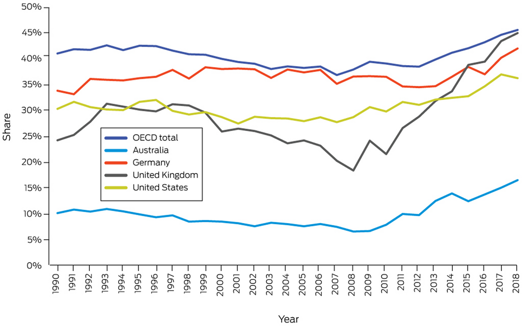 Although there was a slight decline in 2019, the HEVI for Australia over the period 1990–2019 is high and shows an upward trend (Box 1). In comparison to elsewhere, Australia’s HEVI far surpasses the global average and also the average for all World Health Organization (WHO) regions of the world.13