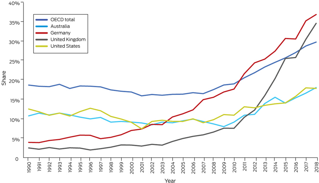 As can be seen from Box 17 and Box 18, countries such as Germany and the United Kingdom continue to be leading the adoption of renewable and low carbon energy sources. The recent German data show that the upward trend has continued in recent years, with renewables contributing to 37% of energy production in Germany.66 From 1990 to 2018, the share of electricity generation from renewable sources increased from 8% to 18%, and from 7% to 17% from low carbon sources in Australia.66 While some reports indicate renewable electricity generation might have been as high as 21–24% in 2019,67,68 Australia continues to have a much smaller proportion of electricity from low carbon sources compared with leading countries.