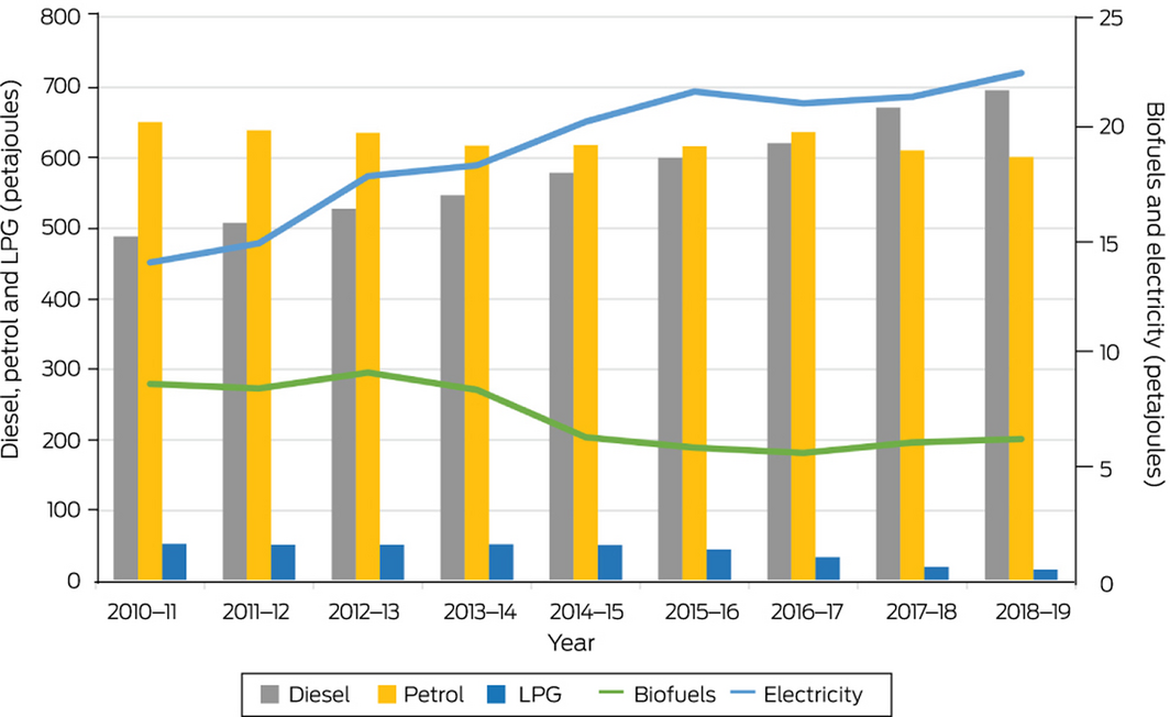 The transport system is the largest user of energy and the third largest source of greenhouse gas emissions in Australia.79,80 The transition to low and zero emission vehicles is an important priority to achieving a sustainable transport system and also delivering environmental and health co‐benefits. In recent years, Australia has presided over significant growth in transport fuel consumption, mostly in diesel use (Box 19), with fossil fuels continuing to hold the major share in the primary energy consumption.81 On a positive note, the use of electricity as a fuel increased steadily during the period 2010–2019 (Box 20), despite few policies or incentives supporting the uptake of electric vehicles, the higher upfront purchase price for electric vehicles, and the limited choice of vehicles.82 As can be seen from Box 20, the sale of electric vehicles in Australia peaked in 2019 with sales tripling from 2216 in 2018 to 6718 in 2019.83 Despite the current reliance on fossil‐fuelled transport in Australia, there are positive signs that with policies that promote clean fuels it is likely we will continue to see the upwards (not yet exponential) trend in electric vehicles in Australia. In addition to this transition to electric vehicles, decarbonisation of road transport will require increased walking, cycling and public transport use, and reduced travel such as by working from home (Supporting Information 3.7).84 Furthermore, increased walking and cycling for short trips would produce substantial health benefits from the increase in physical activity.85 Representing only 1.8% of all trips in urban areas, cycling rates in Australia are much lower than those in the Netherlands (26.8%), Japan (11.5%) and Germany (9.3%), so Australians have a lot to gain from the promotion of this mode of transport.86