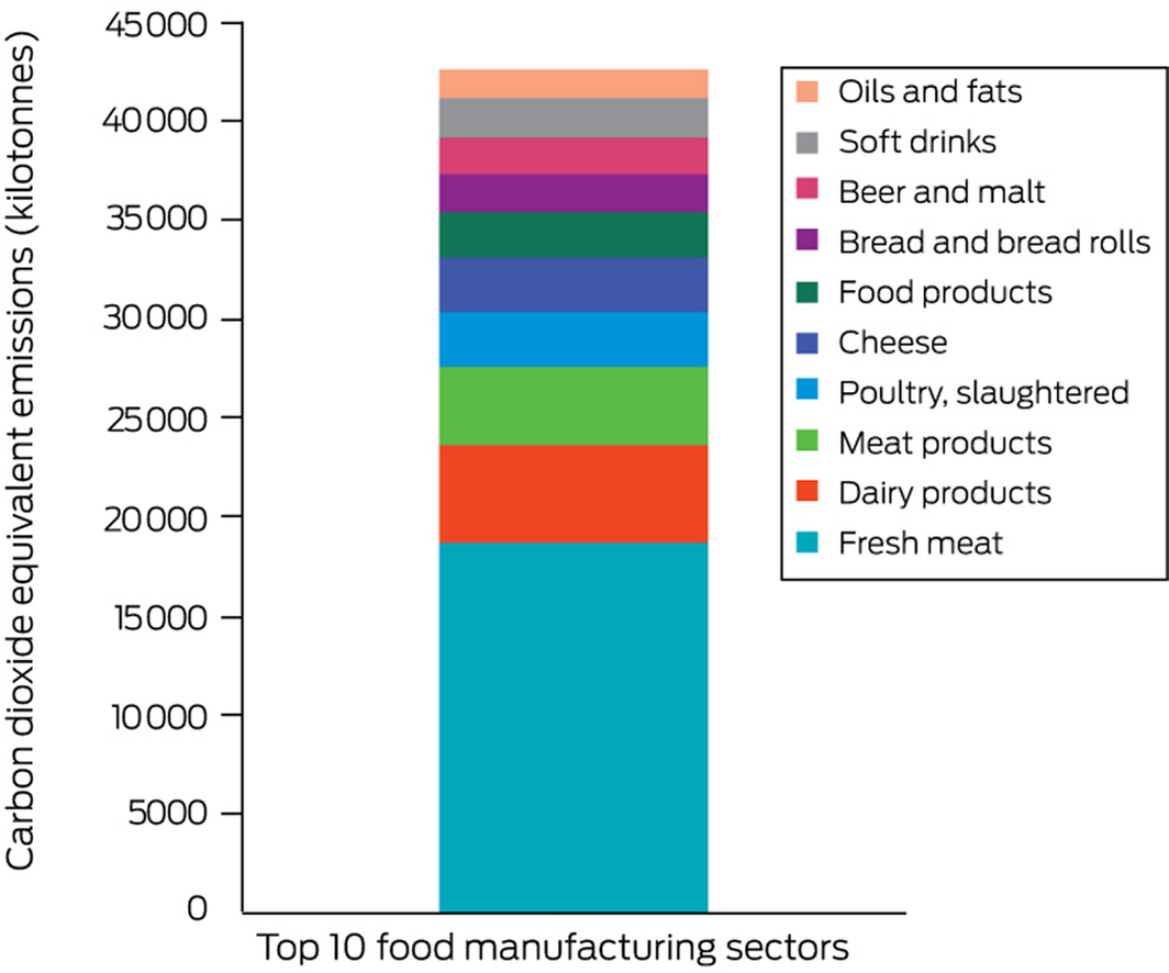 According to the National Greenhouse Gas Inventory,87 the production‐based emissions for agriculture in Australia were 75 588 kilotonnes in 2018. Using a consumption‐based approach, based on input–output analysis, the entire supply chain of primary agriculture and food consumption sectors was analysed. The assessment found that consumption‐based emissions in 2018 were 17 021 kilotonnes for primary agriculture sectors and 53 448 kilotonnes for food consumption. Primary agricultural sectors include sectors such as beef cattle, vegetables, fruits, dairy cattle, sheep and lambs. Food manufacturing sectors primarily encompass sectors that use primary agricultural products and transform those into products that are often consumed by humans; for example, fresh meat, dairy products, food and other meat products. Sectors that contribute to most of the footprint of the aggregated agricultural and food sectors are shown in Box 21 and Figure A9 in the Supporting Information, with beef cattle and fresh meat, respectively, being by far the largest contributors (Supporting Information 3.8).