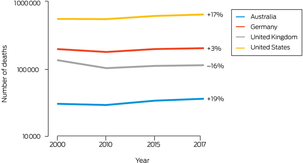 New to the 2021 report, this indicator presents the change in deaths attributable to dietary risks and the consumption of excess red meat. Methods, data and results were provided by the Lancet Countdown.11 Between 2000 and 2017, all diet‐related deaths in Australia increased by 19%, from 30 771 to 36 606. Compared with other high income countries such as Germany (increased by 3%), the UK (dropped by 16%) and the US (increased by 17%), there is room for Australia to improve policies and practices to prevent mortality from unhealthy diet (Box 22). During the same time period, the number of deaths due to excess red meat consumption in Australia decreased by 8%, from 6742 deaths in 2000 to 6194 deaths in 2017, but there was a 13% increase from 5488 deaths in 2010 (Supporting Information 3.9, Figure A10). Decreases in the production of beef cattle (see indicator 3.8) and consumption of excess red meat would have the co‐benefits of reducing Australia’s greenhouse gas emissions and diet‐related deaths.