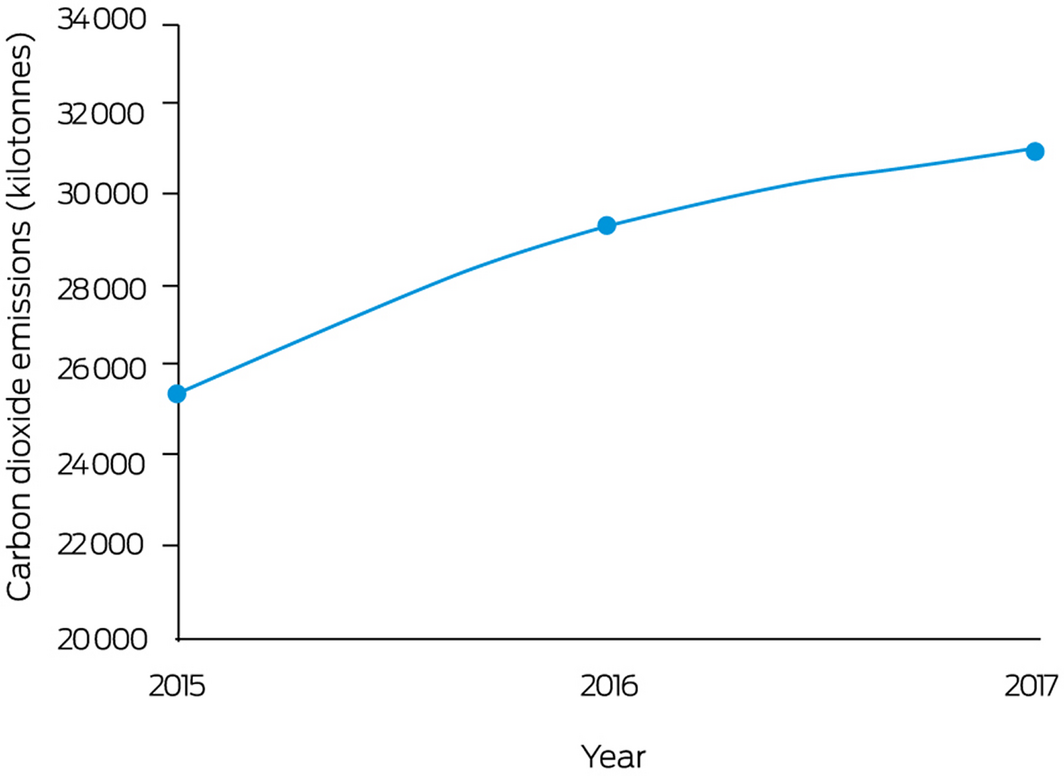 This indicator provides a quantitative assessment of the total (direct plus indirect) CO2‐equivalent emissions embodied in Australia’s health system. This indicator builds on previous work88,89 by constructing a time series of subnational multiregional tables from 2015 to 2017, featuring all Australian jurisdictions. As such, the findings presented in this indicator are based on different input–output databases from the ones used by previous studies in this space. The subnational tables are then integrated with data on health expenditure for about 15 unique health sectors, and the hybridised model is subjected to Leontief input–output calculations for assessing supply chain impacts of Australia’s health system over time. We observe that, over time, Australia’s health sector emissions have increased (Box 23). This rise in emissions is consistent with trends observed for the global health sector,90 due to rising expenditures. Australia’s health system accounts for about 5.5% of the country’s greenhouse gas emissions.89 Multiple studies assessing the environmental impacts of health systems identify hospitals, pharmaceuticals and medicinal goods as key contributors for the bulk of the emissions of the health system90,91 (Supporting Information 3.10).