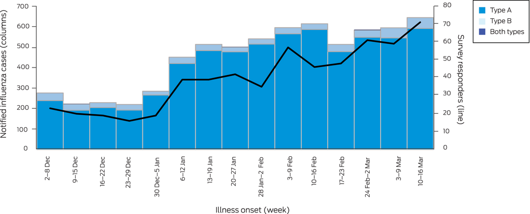 Box 1 – Epidemic curve for influenza notifications (cases), New South Wales, 2 December 2018 – 16 March 2019, by influenza type and illness onset week, and survey responders (cases) by illness onset week*