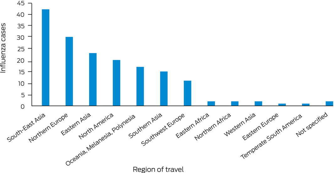 South‐East Asia was the most frequently visited of the World Health Organization (WHO) influenza transmission zones9 by people with notified influenza (42 of 134 respondents); 29 cases had visited two or more zones (Box 5). The most frequently visited countries were Singapore (20 travellers), New Zealand (15), the United States (15), and United Kingdom, Japan and Indonesia (12 each). Interstate travel was reported by 46 people with notified influenza, including to Queensland by 23 and to Victoria by 13.