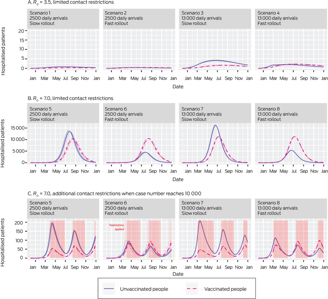 Design: Population‐level deterministic compartmental epidemic modelling of eight scenarios applying various assumptions regarding SARS‐CoV‐2 transmissibility (baseline R0 = 3.5 or 7.0), vaccine rollout speed (slow or fast), and scale of border re‐opening (mean of 2500 or 13 000 overseas arrivals per day).