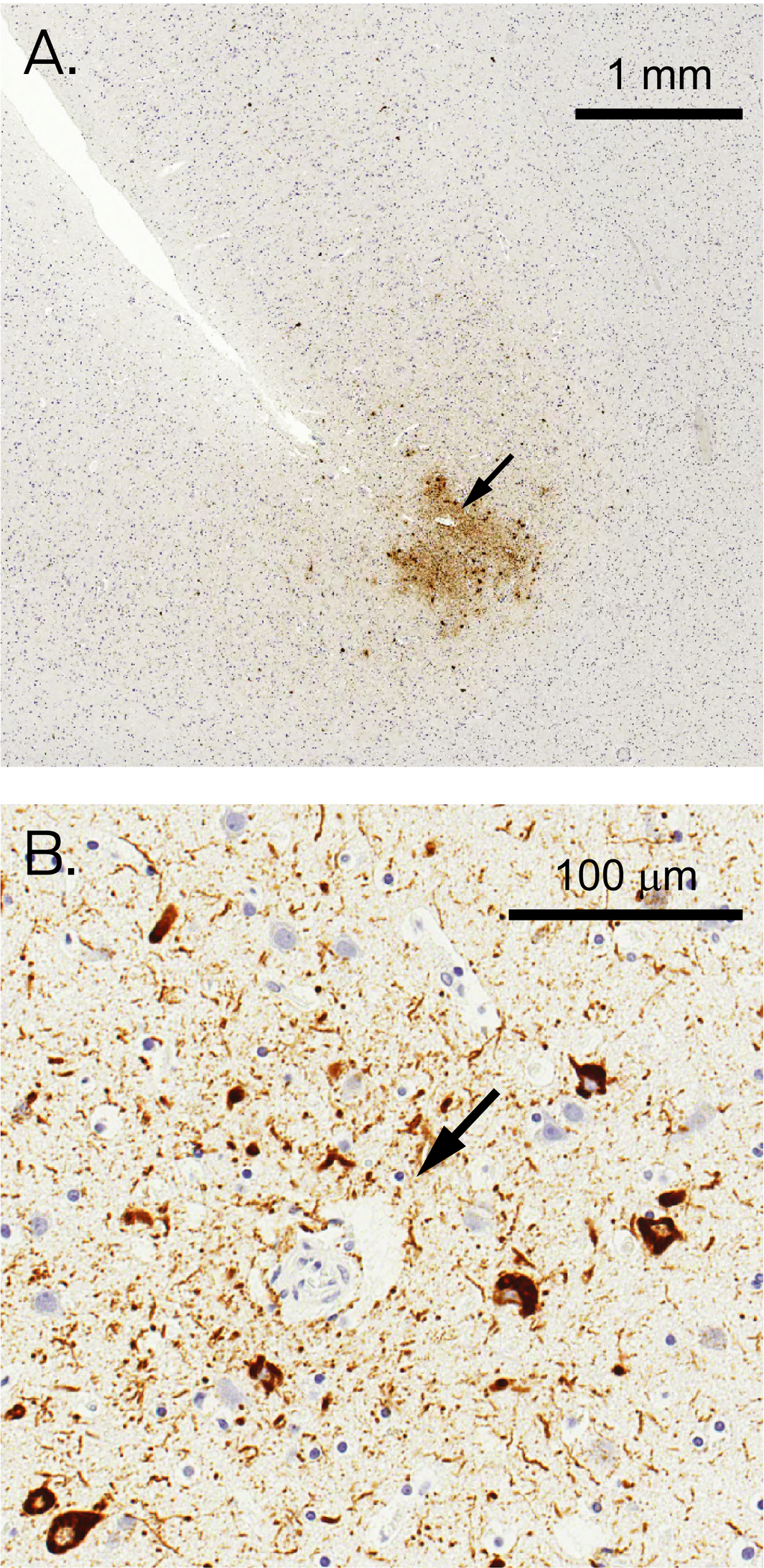 Box 1 – Representative chronic traumatic encephalopathy lesions. A. Low power (magnification: 4×), B. high power (magnification: 40×) images*