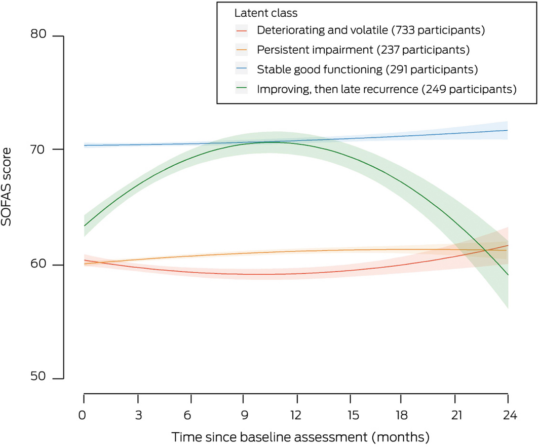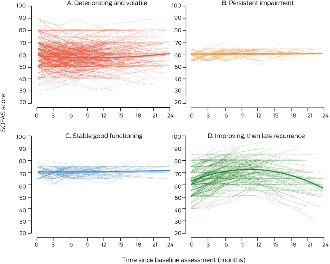 Trajectory‐based modelling takes into account the heterogeneity of young people who require mental health care by identifying subpopulations of young people, with the aim of guiding service planning and strategies for improving long term functional outcomes.9,10 Our study evaluated trajectories of functioning during the first two years of early intervention care, and identified factors associated with these trajectories.
