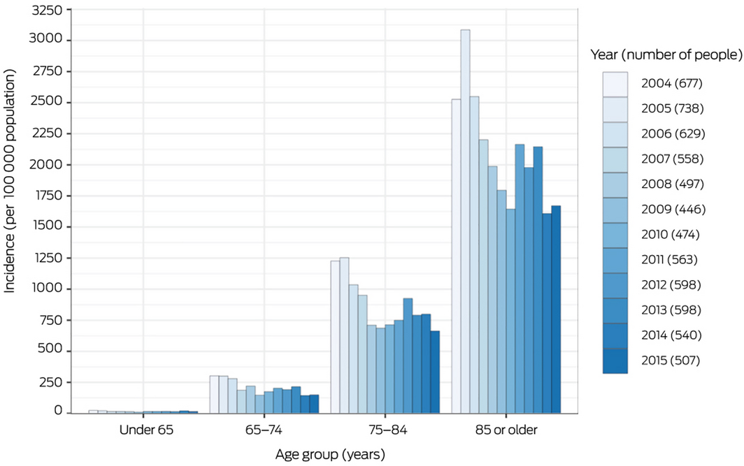 The annual incidence of stage 4 CKD declined in each age group during 2004–2007 and has since been relatively stable; it increased markedly with age (Box 2). However, kidney replacement therapy was relatively infrequent among people aged 85 years or more (Supporting Information, figure 2, table 5).