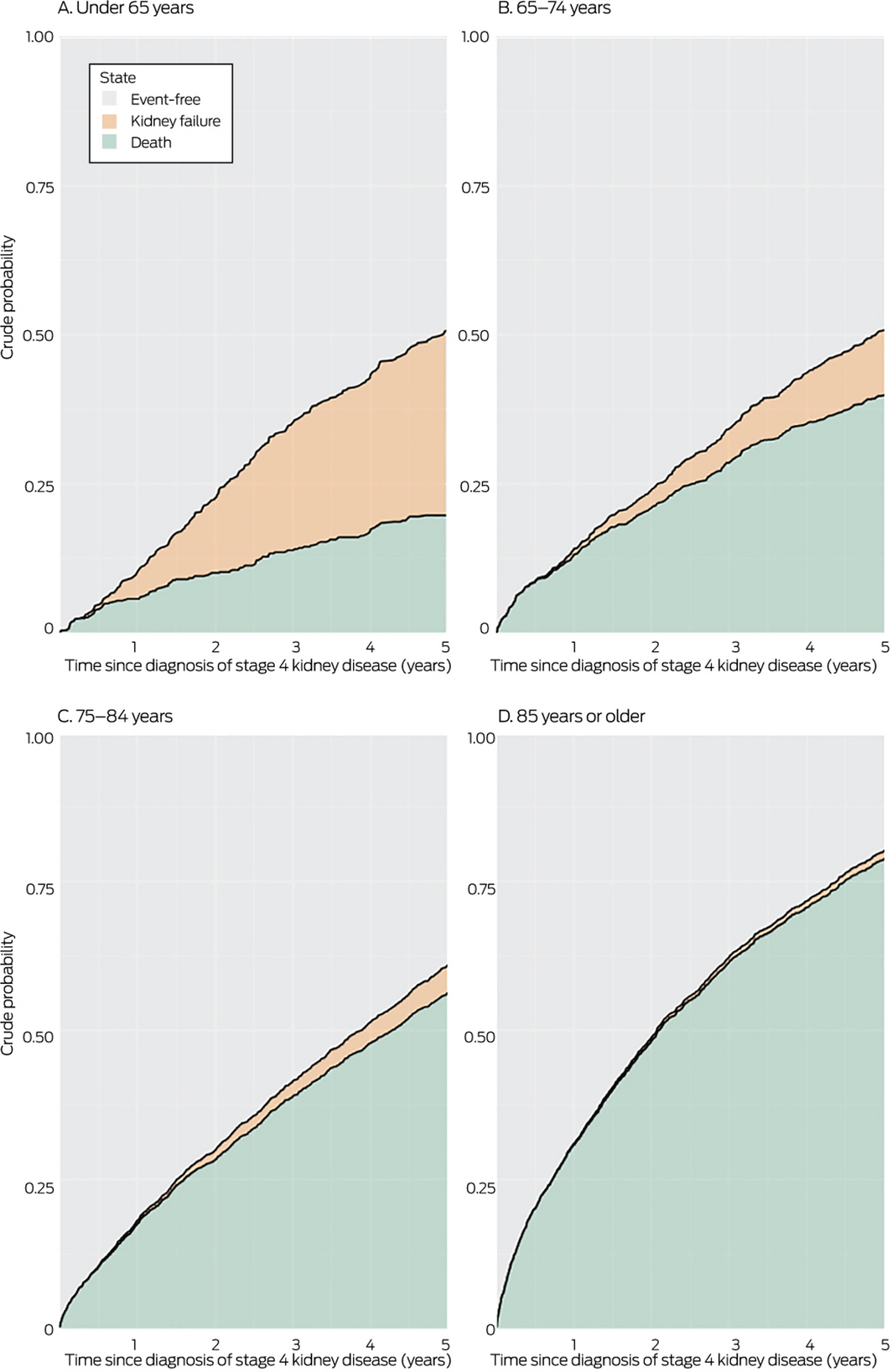 Conclusions: For older Australians with incident stage 4 chronic kidney disease, the risk of death is higher than that of kidney failure, and the latter risk declines with age. Clinical guidelines should recognise these competing risks and include recommendations about holistic supportive care, not just on preparation for dialysis or transplantation.