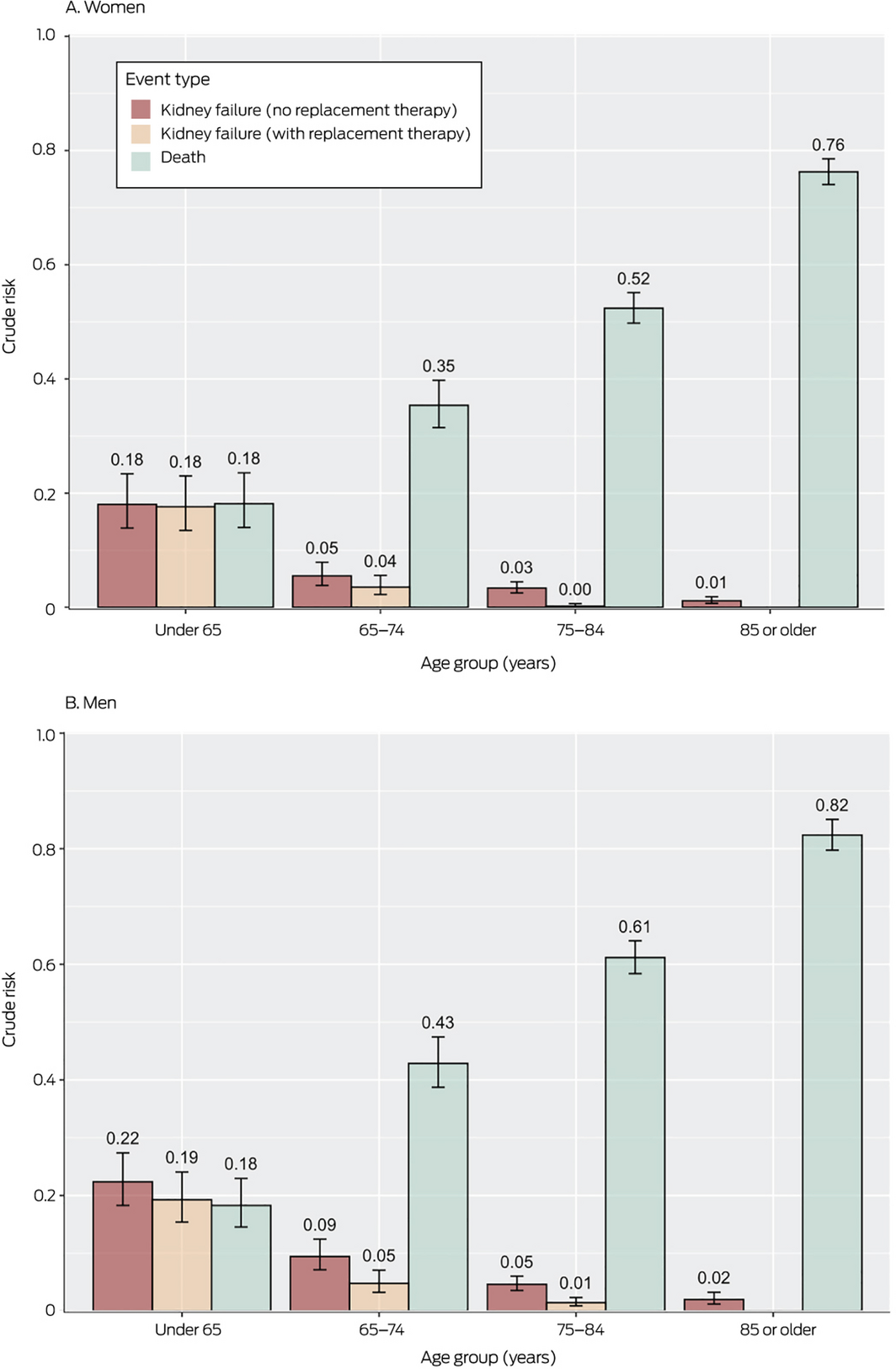 The 5‐year risk of kidney failure was lower for women than men in all age groups; the 5‐year risk of death was also lower for women, except for those under 65 years of age. The risks of kidney failure with kidney replacement therapy were similar for men and women in all age groups (Box 4).