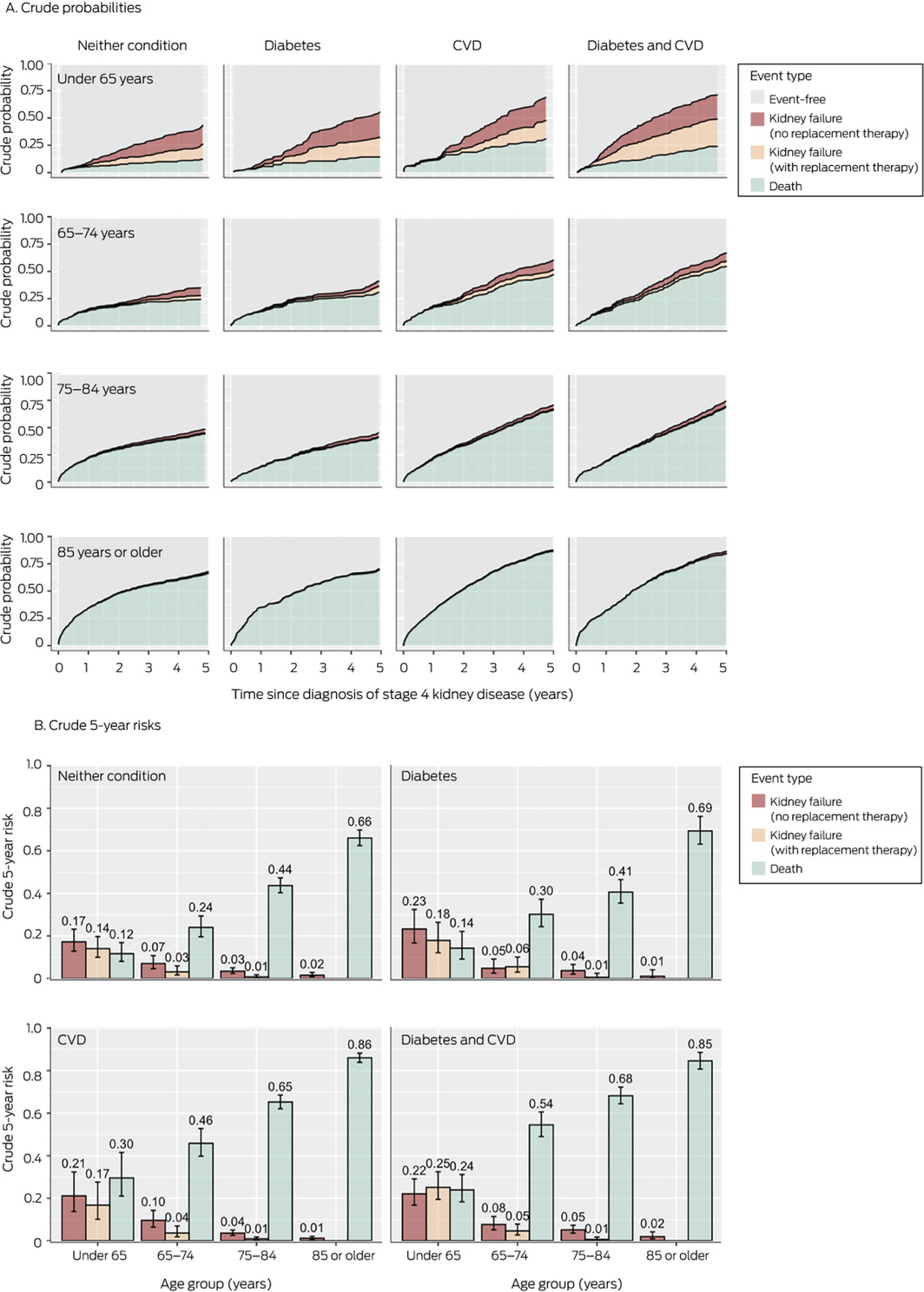 Box 6 – Probabilities and 5‐year risks of death and kidney failure within five years of diagnosis of stage 4 kidney disease, by age group and comorbid diabetes mellitus and cardiovascular disease (CVD)*