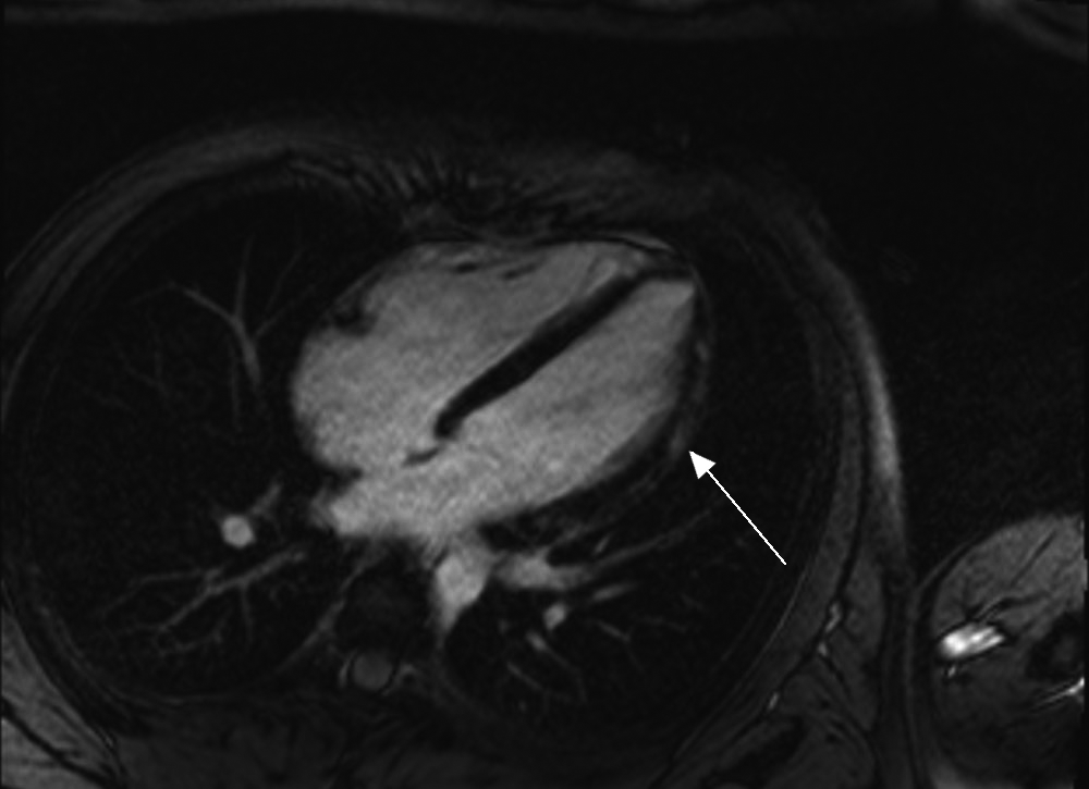 Transthoracic echocardiography showed normal biventricular function with no pericardial effusion. Cardiac magnetic resonance imaging showed normal left ventricular size and mildly impaired systolic function with hypokinesis of the mid and apical lateral segments associated with epicardial late gadolinium enhancement (Box 2), consistent with myocarditis.
