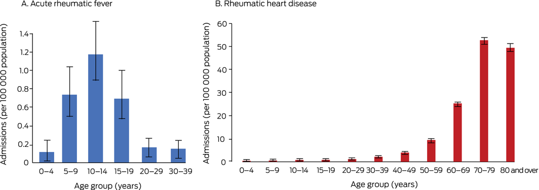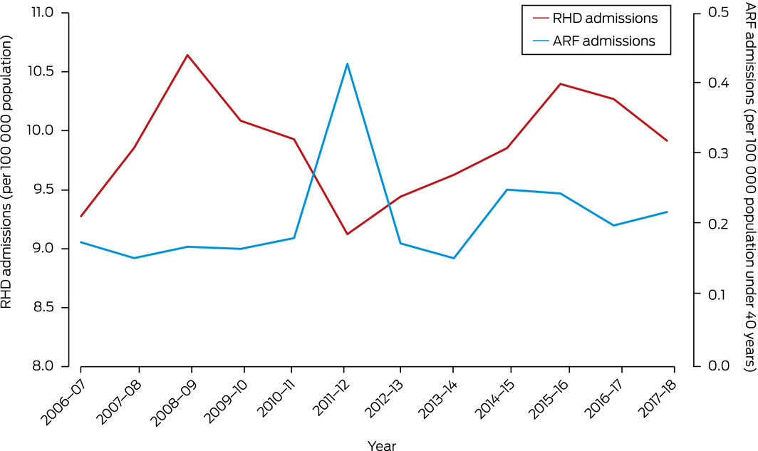 Among people under 40 years of age, the annual rate of admissions with ARF was higher for Indigenous (1.8 [95% CI, 0.8–3.6] per 100 000 population) than for non‐Indigenous people (0.4 [95% CI, 0.3–0.4] per 100 000; IRR, 4.9; 95% CI, 2.4–10), as was that of admissions with RHD (4.1 [95% CI, 2.4–6.5] v 1.1 [95% CI, 1.0–1.2] per 100 000 population; IRR, 3.8; 95% CI, 2.4–6.2) (Supporting Information, table).