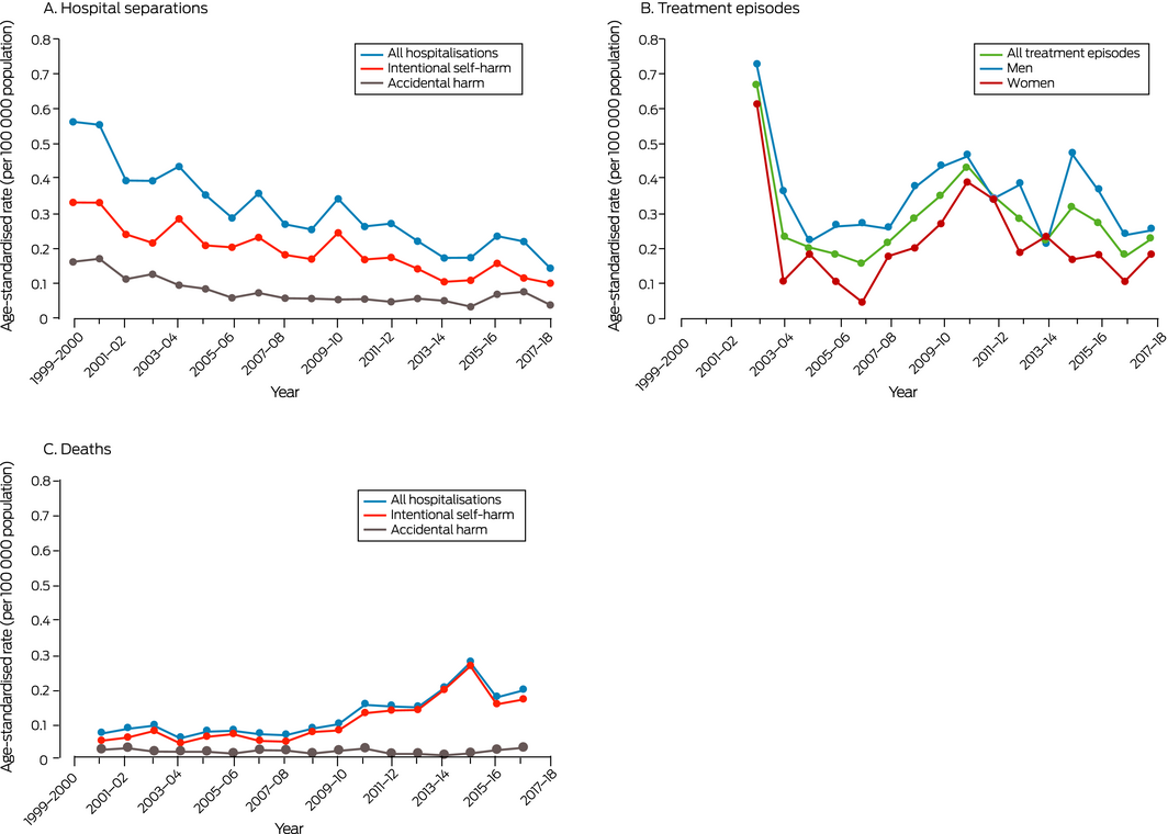 This work was funded by the National Drug and Alcohol Research Centre at the University of New South Wales, and is funded by the Australian Department of Health. We acknowledge the Australian Institute of Health and Welfare and jurisdictional data custodians for providing data from the National Hospital Morbidity Database and the Alcohol and Other Drug Treatment Services National Minimum Data Set. We acknowledge the Victorian Department of Justice and Community Safety as the source organisation for the coronial data analysed, and the National Coronial Information System as the data source.