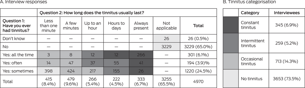 Box 1 – Tinnitus status of 4970 interviewees, according to their responses to the two tinnitus‐related questions in the Australian Workplace Exposure Survey (AWES) ‒ Hearing survey