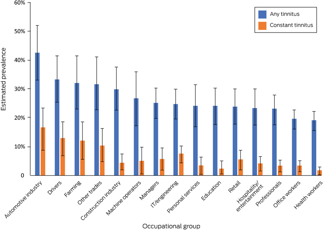 The new: We estimate that about one‐quarter of Australian workers experience tinnitus, including half a million for whom it is always present. Its prevalence is higher among men than women, and increases with age. Tinnitus is more frequent in people employed as automotive workers, drivers, farmers, and in other trades.