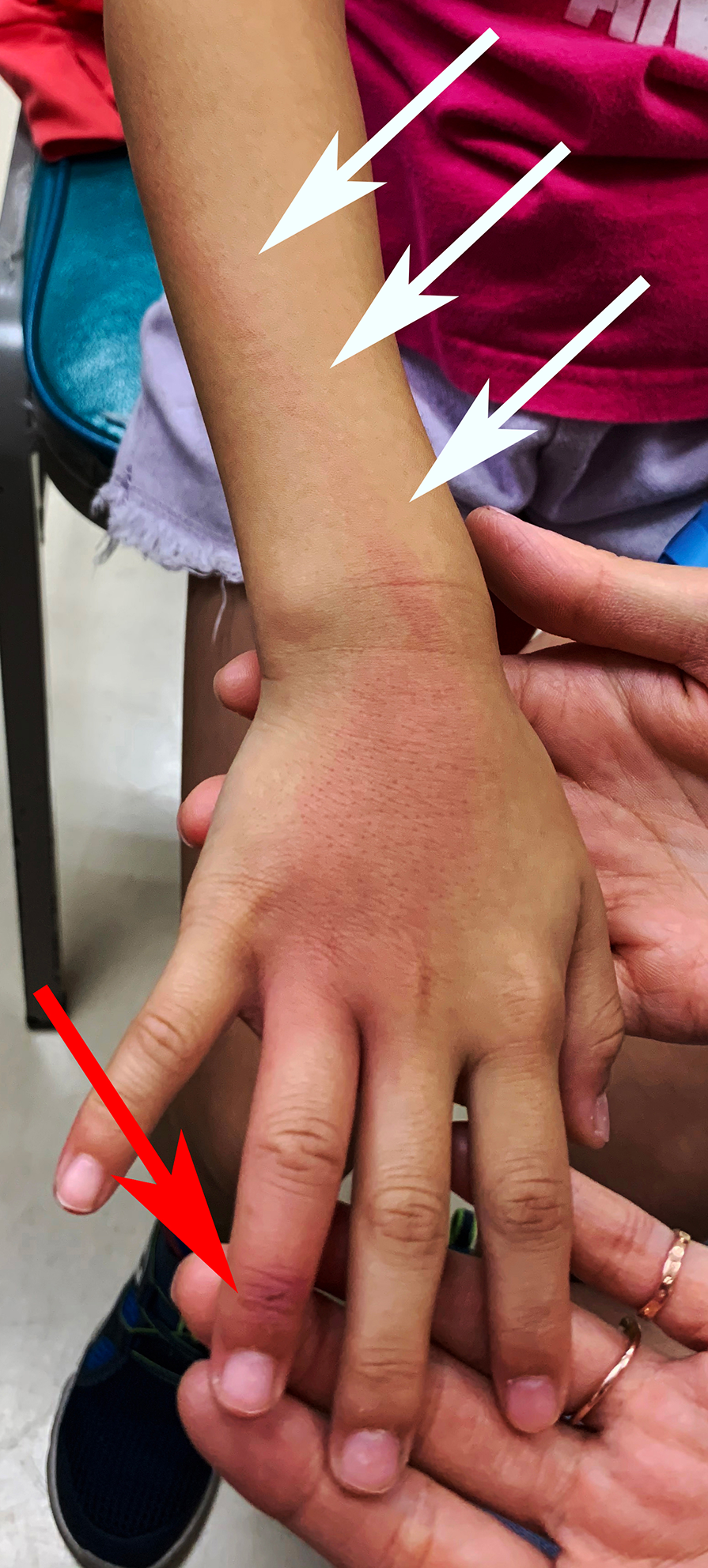 A 7‐year‐old girl presented to the emergency department with fever and right forearm redness. Physical examination revealed a traumatic wound on her right fourth finger, tender erythema of the affected finger (Figure, red arrow), dorsum of the hand, and a linear red streak extending to the elbow (Figure, white arrows), with one palpable tender supratrochlear lymph node (1 × 1 cm). The range of motion of the finger was limited. Staphylococcus aureus infection was confirmed by pus culture. A clinical diagnosis of acute lymphangitis — an infection of the lymphatic vessels — was made.1,2 The patient was successfully treated with oral dicloxacillin and elevation of the forearm.