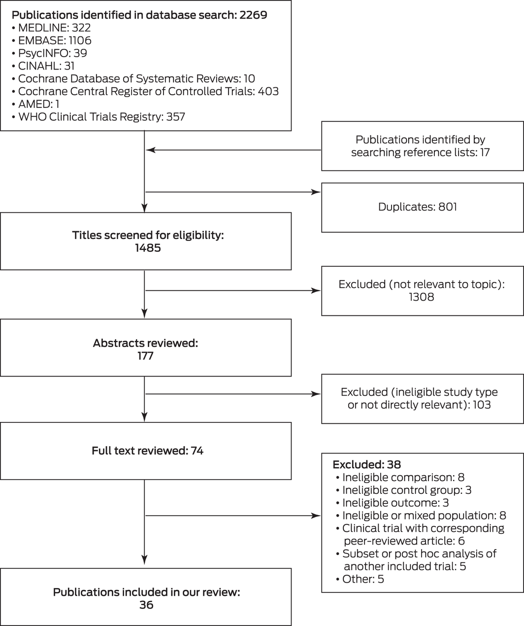 We initially identified 2286 relevant publications, of which 74 were deemed potentially eligible after abstract review; 38 were excluded after reviewing the full text, and 36 publications (all in English) were included in our analysis18,19,20,21,22,23,24,25,26,27,28,29,30,31,32,33,34,35,36,37,38,39,40,41,42,43,44,45,46,47,48,49,50,51,52,53 (Box 1; Supporting Information, tables 3 and 4).